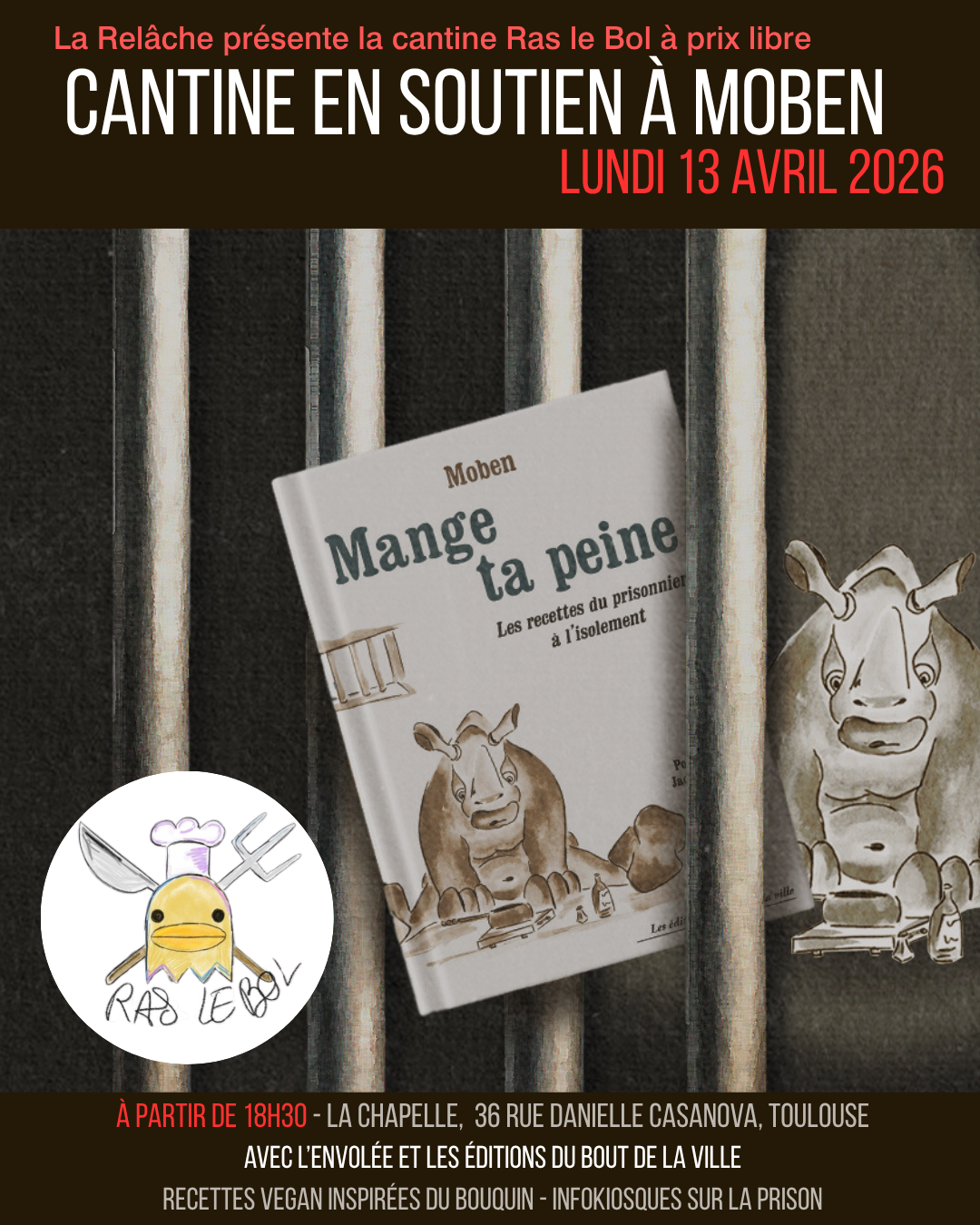 »Ras le Bol » organise une cantine en soutien à Moben et contre l’isolement carcéral, à la Relâche de la Chapelle le lundi 13 avril 2026, avec les Éditions du bout de la ville et L’Envolée.